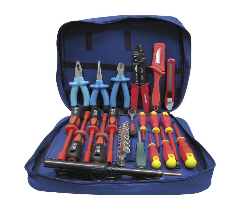 Набор инструментов диэлектрический Диэлектрик №1 предназначен для безопасной работы при проведении ремонтно-монтажных работ в электроустановках, в сетях, которые используются электриками при работах под напряжением до 1000 В. В наборе представлены профессиональные диэлектрические инструменты- плоскогубцы, кусачки, длинногубцы, отвертки, набор торцевых головок, паяльник, стриппер, клещи обжимные со сменными плашками. В составе из 23 предметов, поставляется в инструментальной сумке с ручками для удобной переноски и плечевым ремнем.