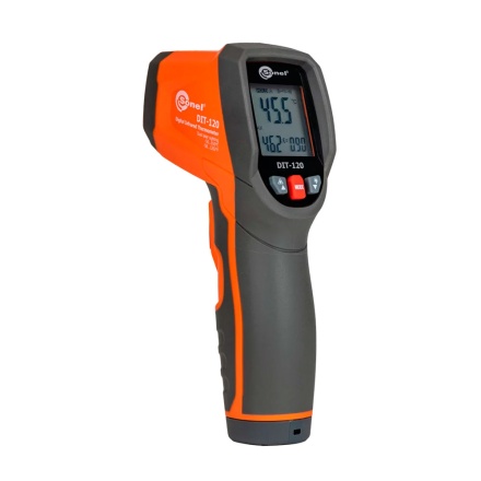 DIT-120 – инфракрасный измеритель температуры (пирометр). Современный прибор, позволяющий бесконтактным методом измерить температуру поверхности любых объектов: электронные компоненты, пластик, металл, дорожные покрытия, пластик, дерево, легко воспламеняемые объекты.