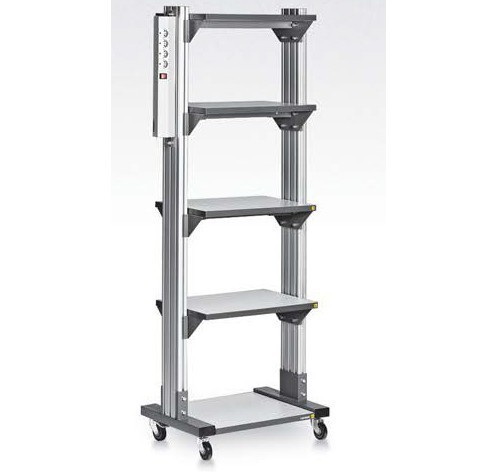 Стойка предназначена для размещения дополнительного оборудования и перемещения элементов в рабочей зоне. Оборудована пятью полками, свободно регулируемыми по высоте, и электромонтажной панелью (½ ЭПА-12) с 4 розетками и выключателем. Панель располагается сбоку, что позволяет эффективно использовать верхнюю полку.