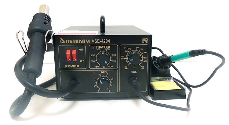 Ремонтная система с термовоздушным каналом и каналом для монтажа ASE-4204 оснащена интеллектуальной системой охлаждения с автовыключением. Применяется в производственных помещениях для монтажа электро-радиоэлементов, чувствительных к статическому электричеству. Имеет антистатическое исполнение и широкую номенклатуру сменных наконечников.